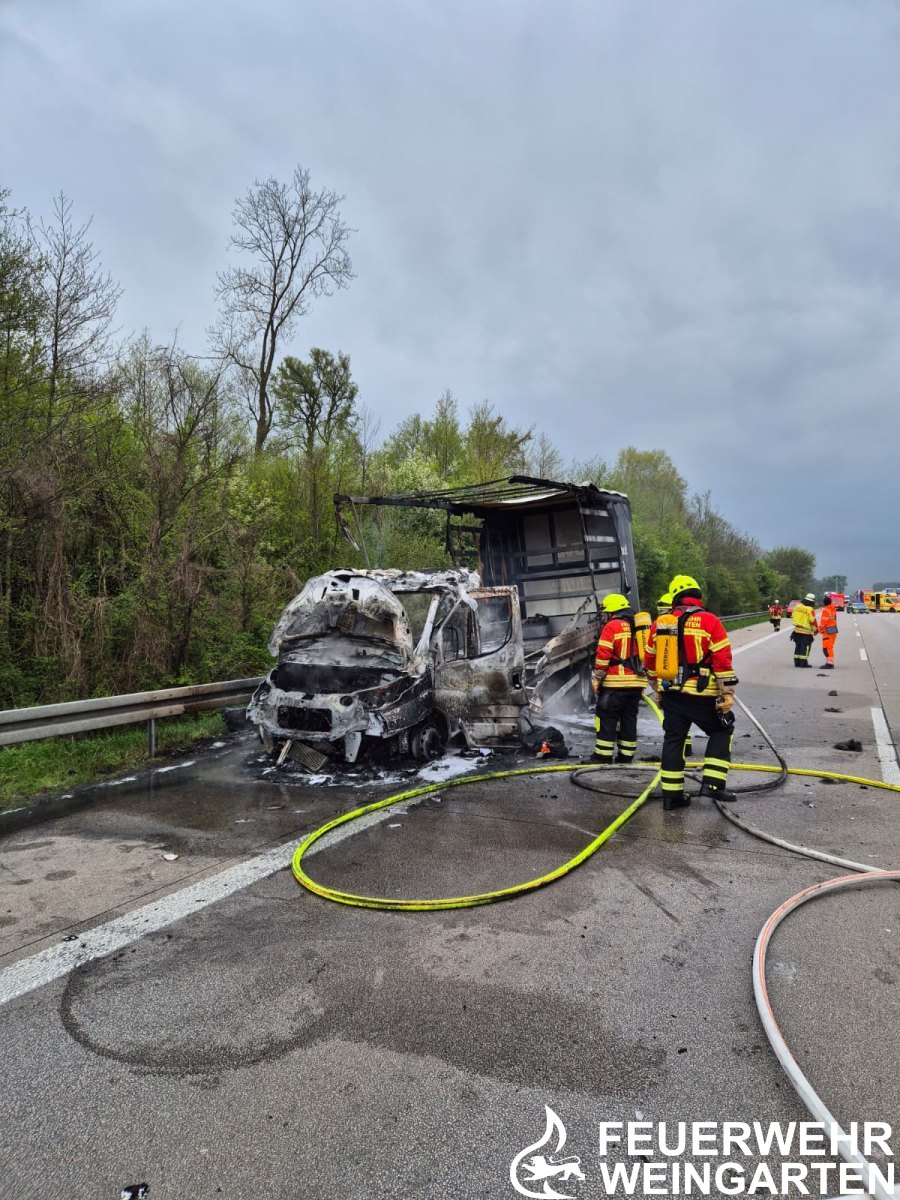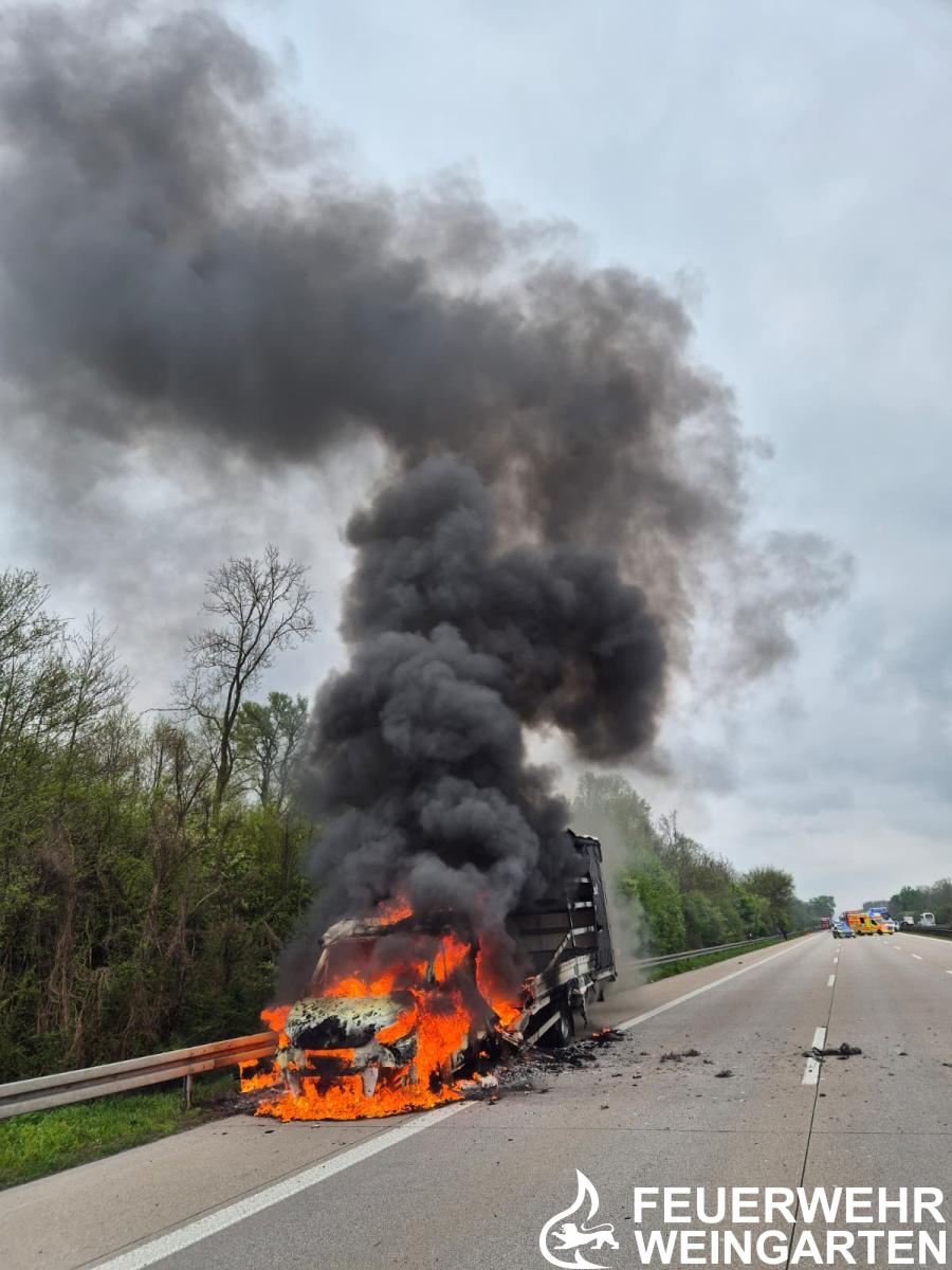 Vor Ort stand ein Kleintransporter in Vollbrand. Umgehend wurden zwei Trupps unter Atemschutz zur Brandbekämpfung eingesetzt. Das Feuer konnte durch unsere Einsatzkräfte zügig gelöscht werden. Die Berufsfeuerwehr Karlsruhe unterstützte an der Einsatzstelle und übernahm die Wasserversorgung an das Löschfahrzeug der Feuerwehr Weingarten. Verletzte Personen waren glücklicherweise nicht zu verzeichnen.